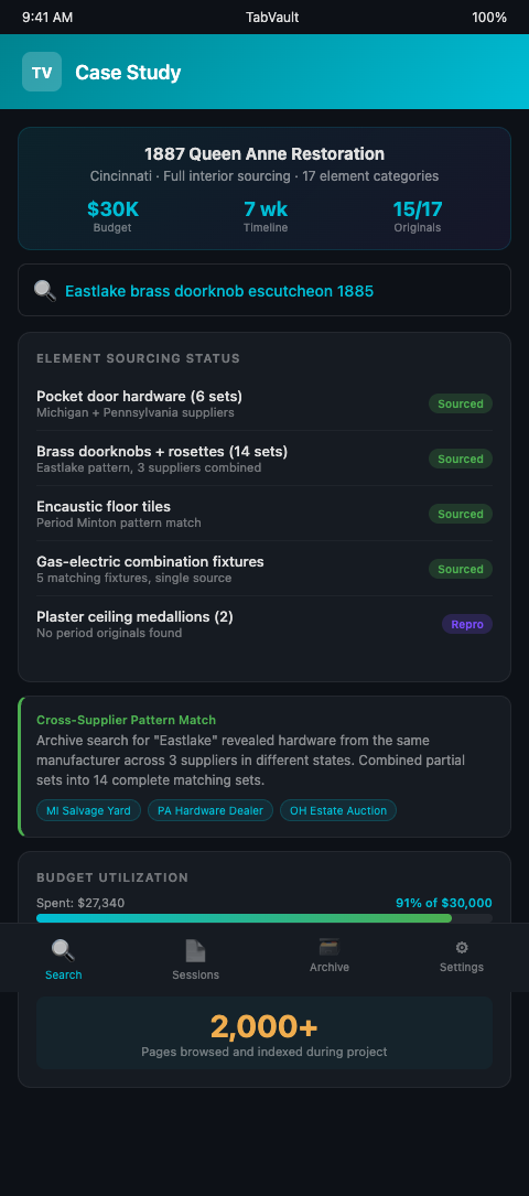For future projects involving similar periods, the archive from a completed project becomes a head start. The dealer's Cincinnati archive, containing over two thousand indexed pages of Victorian salvage research, becomes the foundation for the next Queen Anne project. Suppliers, pricing patterns, and material availability data carry forward without any additional research. This compounding effect is why daily sourcing habits built around indexed search pay dividends far beyond any single project.