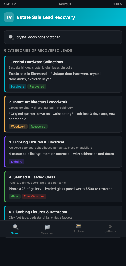 TabVault solves this by making every indexed listing searchable by its actual content. Search "Art Deco sconce" and retrieve every estate sale page that used those words -- even if you viewed the listing three weeks ago and closed the tab the same day. Reclamation dealer lead tracking becomes a search query rather than a memory exercise. The distinction between "I think I saw something about lighting last week" and "here are the four estate sale listings that mentioned sconces, with addresses and dates" is the distinction between guessing and knowing.