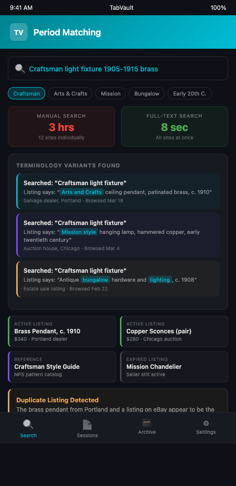 TabVault transforms the matching reclaimed materials by era problem by turning chaotic browser sessions into a searchable private database, indexing the full text of every page a dealer visits. This means the dealer's archive captures not just URLs and titles but the actual descriptions, specifications, and contextual information on every listing page, every reference page, and every research session.