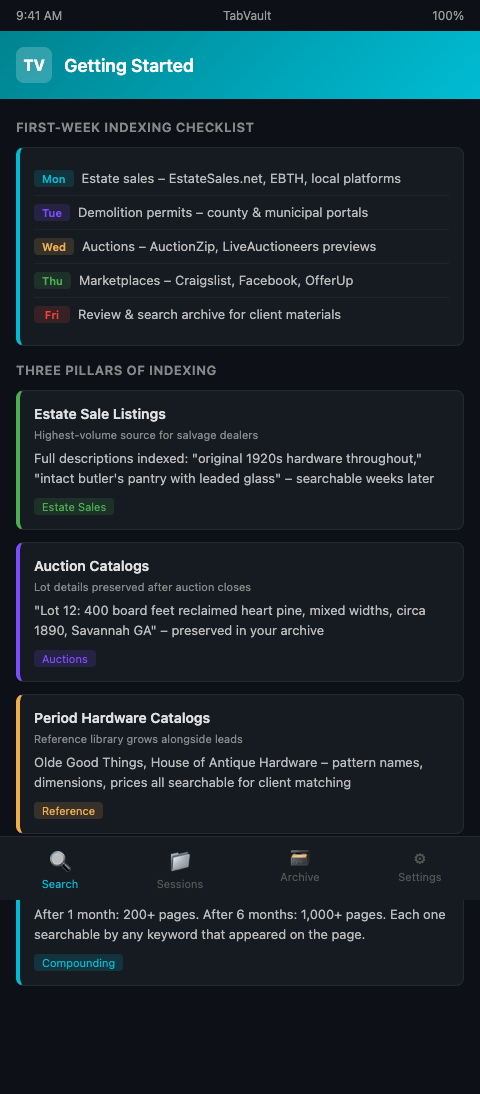 Start with estate sales on Monday, auctions on Wednesday, and catalogs on Friday. By the end of your first week, TabVault has indexed fifty or more pages without a single extra click. After one month, that archive holds hundreds of listings with pricing data, lot descriptions, and hardware specifications you can search by any term. The dealer who has been indexing for six months owns a private reference library spanning thousands of sourcing pages -- the kind of accumulated market knowledge that turns a request for matching Eastlake rosettes from a research project into a ten-second search.