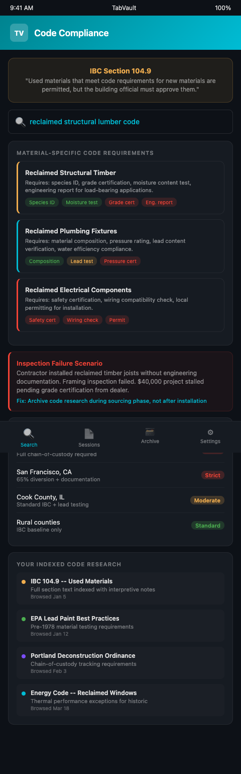 The practical application works like this. A dealer sources reclaimed Douglas fir beams from a warehouse demolition. Before listing them for structural use, she researches the applicable code requirements. She browses the International Building Code section on material reuse, the state's amendments to that section, and the specific county's building department website for local interpretive guidance. TabVault indexes all three pages. Three months later, when a contractor asks whether those beams meet code for a residential floor system in a different county, the dealer searches the archive for "reclaimed structural lumber" and finds her original research alongside any subsequent sessions where she researched related requirements.