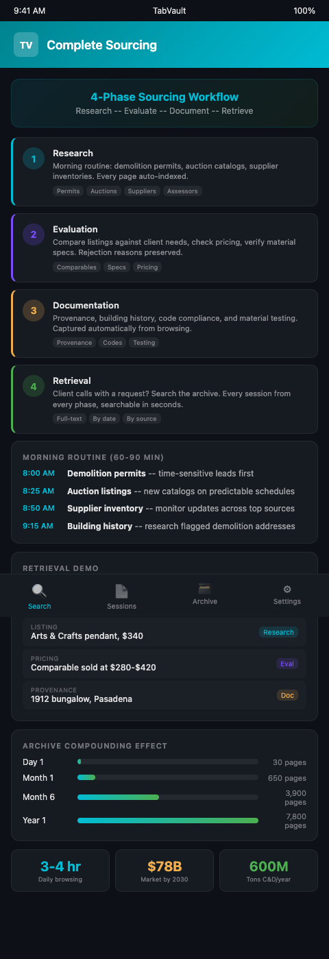 Phase three: documentation. For materials that advance past evaluation, the dealer conducts the provenance and compliance research required for reclaimed architectural elements. Building history, material composition, code compliance, and testing requirements are all researched through browsing sessions that TabVault captures automatically. The documentation phase produces the records that buyers, contractors, and code officials require.