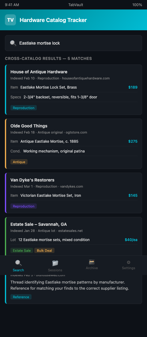 Browse House of Antique Hardware on Monday, Van Dyke's on Tuesday, and Historic Houseparts on Wednesday. By Thursday, a single search for "Eastlake mortise" shows matching listings from all three catalogs with prices and availability side by side. After three months of indexed catalog browsing, you own a private hardware reference spanning hundreds of product pages -- searchable by pattern name, metal type, era, or dimension. That reference turns a restoration contractor's urgent matching request from a multi-day research project into a confident same-day response.
