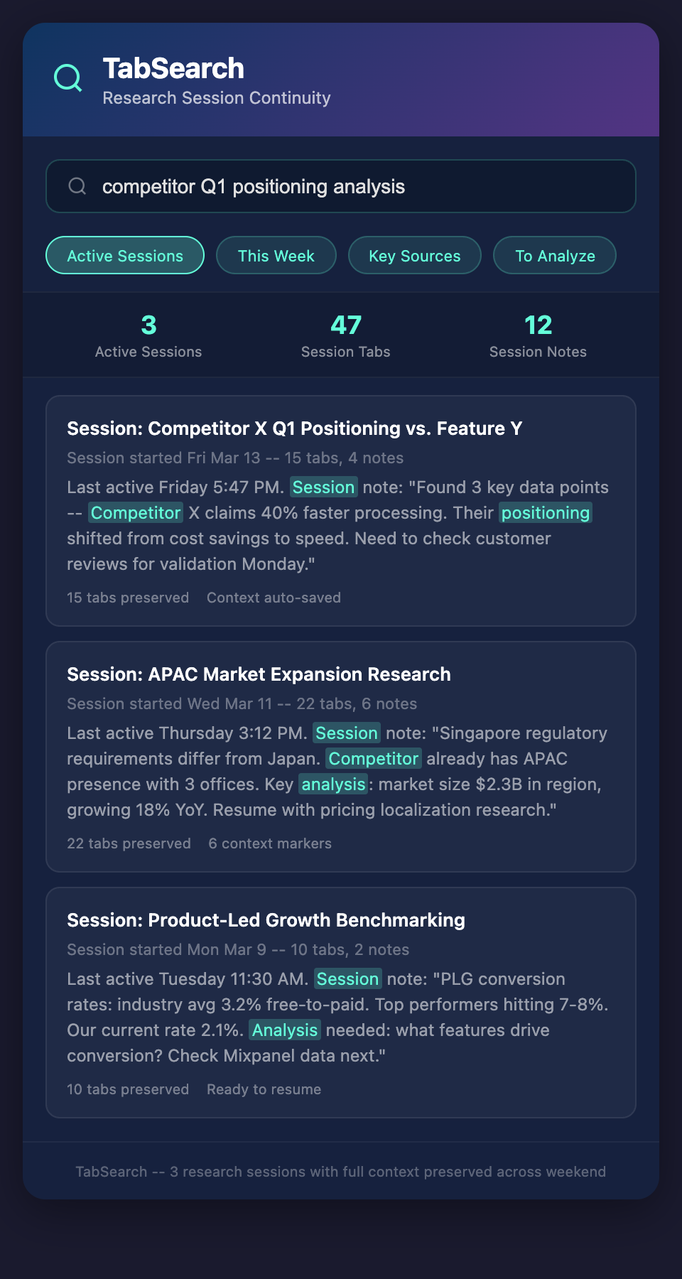 Knowledge workers maintain continuous research sessions across days. You might research a market for three days, switching between your research and other work. The session spans 15-20 tabs but only makes sense together.
