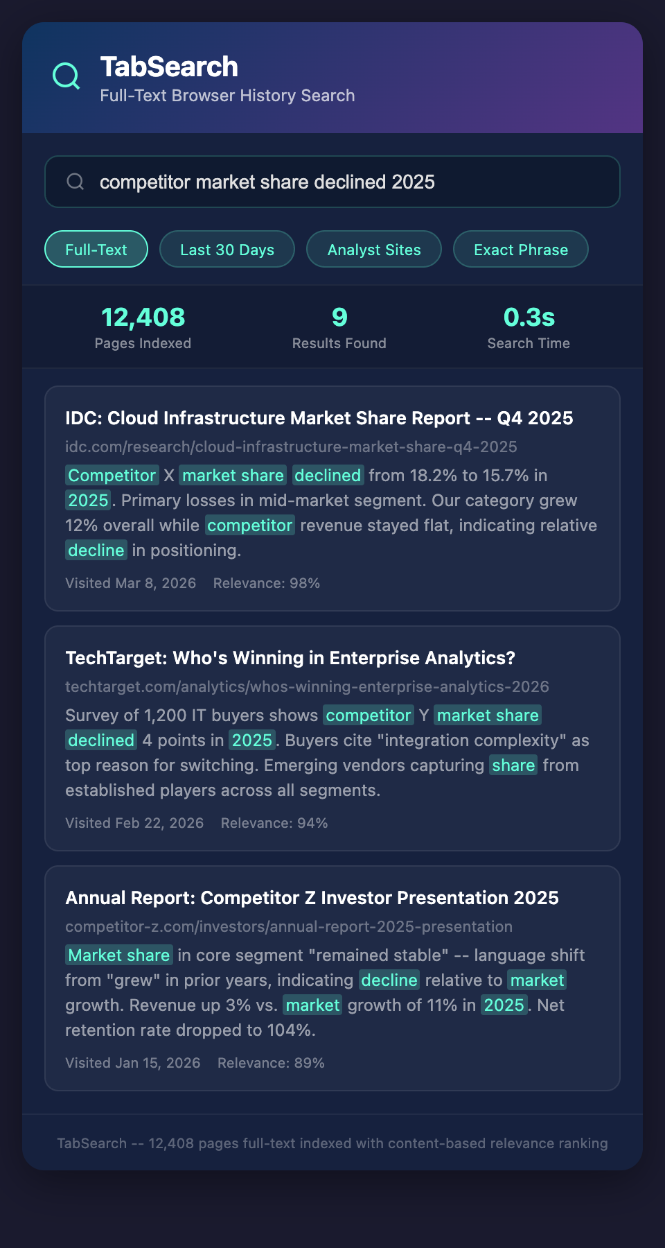 You're preparing for a board meeting and need competitive context. Search your entire browser history for "competitor market share 2025" and get every article, earnings report, and analyst summary you've read containing this information.