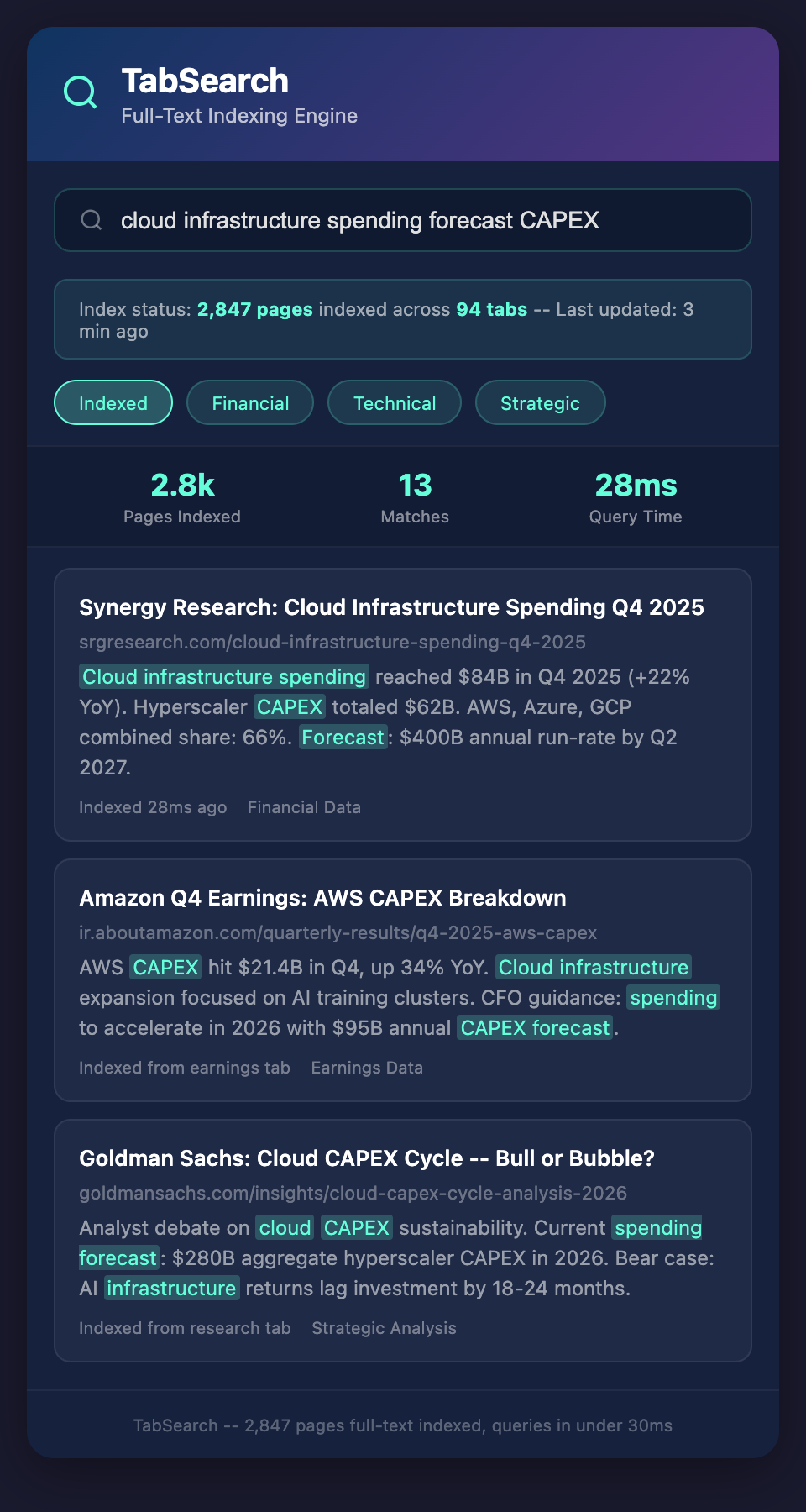 Meanwhile, a competitor operating with proper indexing and search finds the same five sources in 45 seconds.
