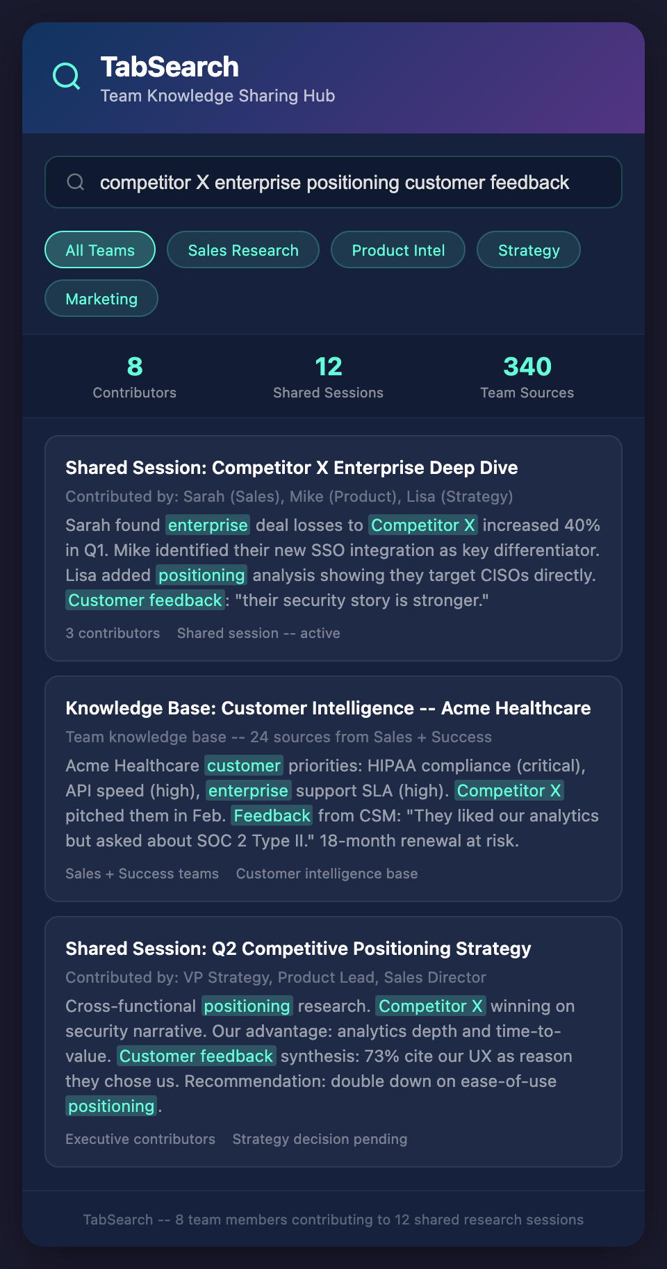 Competitive intelligence base: All competitive research across the organization—sales research, product competitive analysis, strategic competitive monitoring—lives in one searchable place. New employees can learn competitor landscape in hours instead of months. Sales can instantly answer "What do we know about competitor X?"