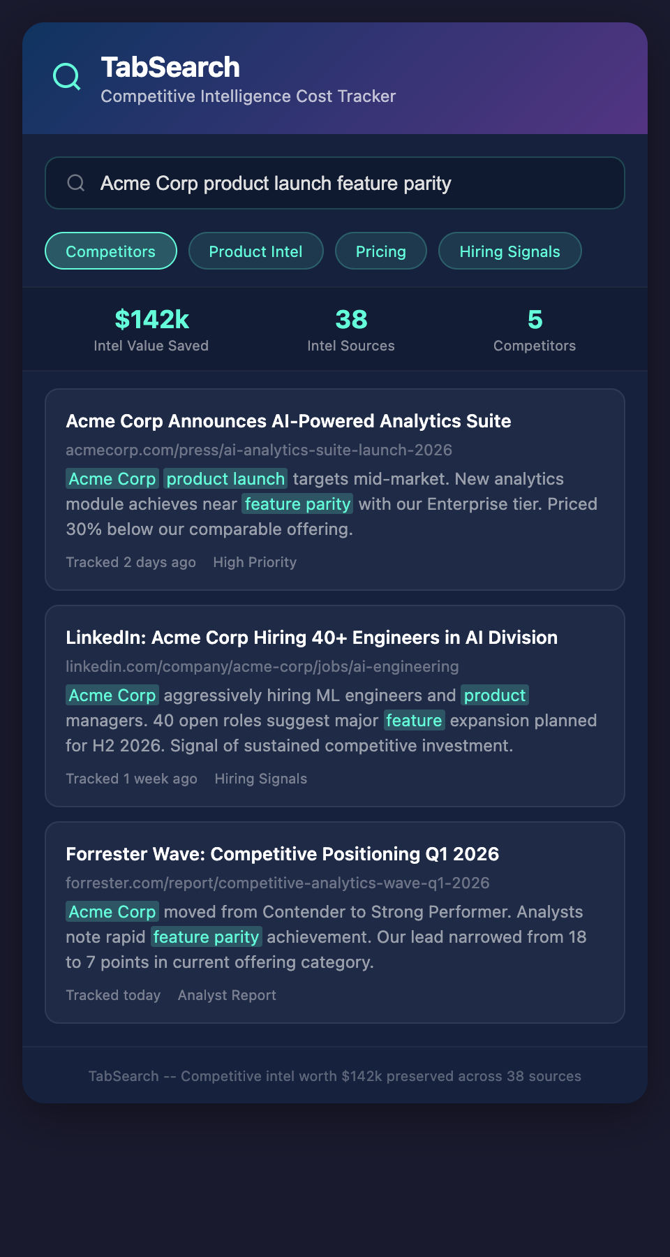 TabSearch Intelligence Cost Tracker mockup