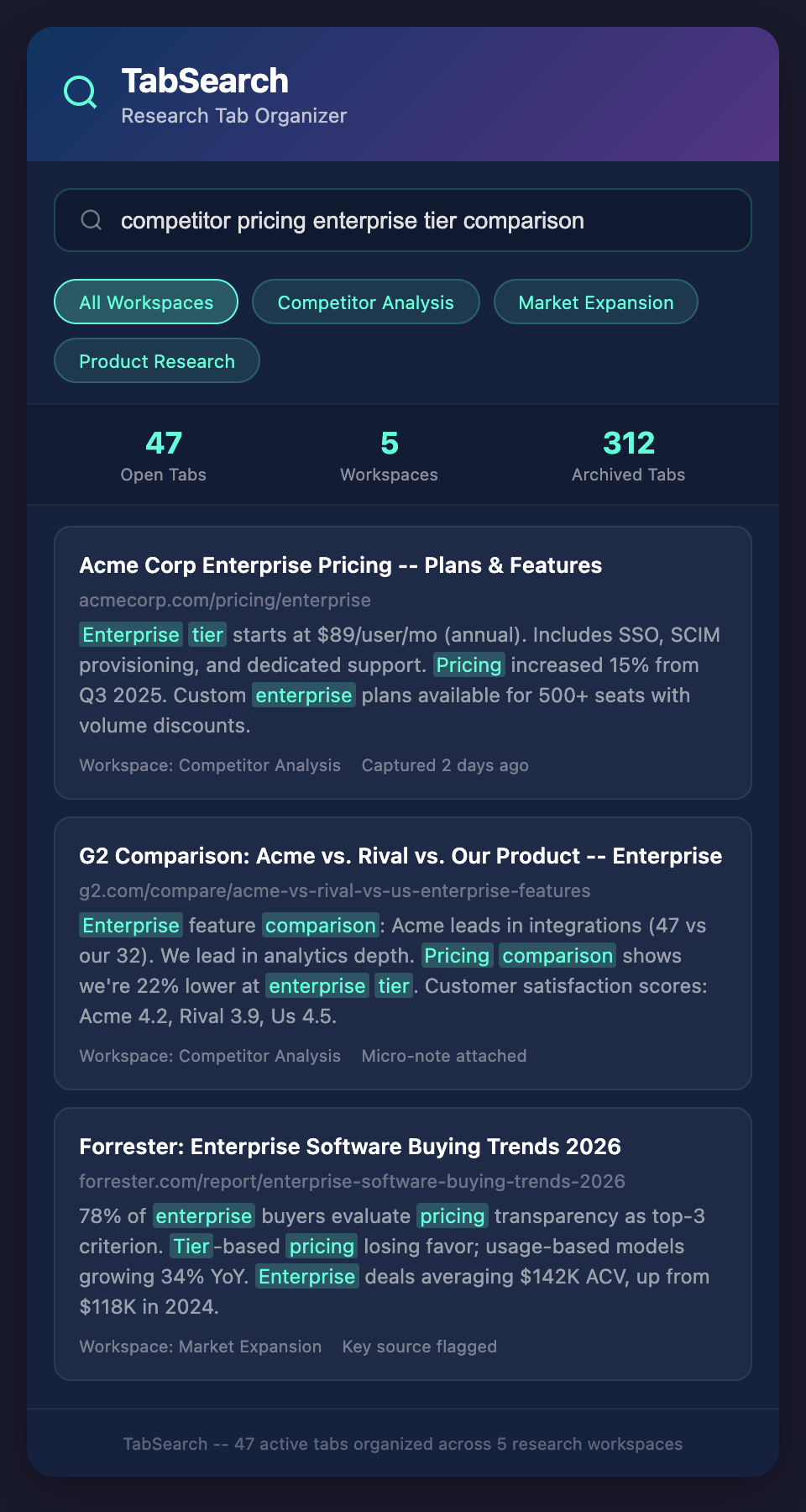The missing piece in traditional tab management is full-text search. You need to be able to search across all the content you've gathered, not just tab titles.