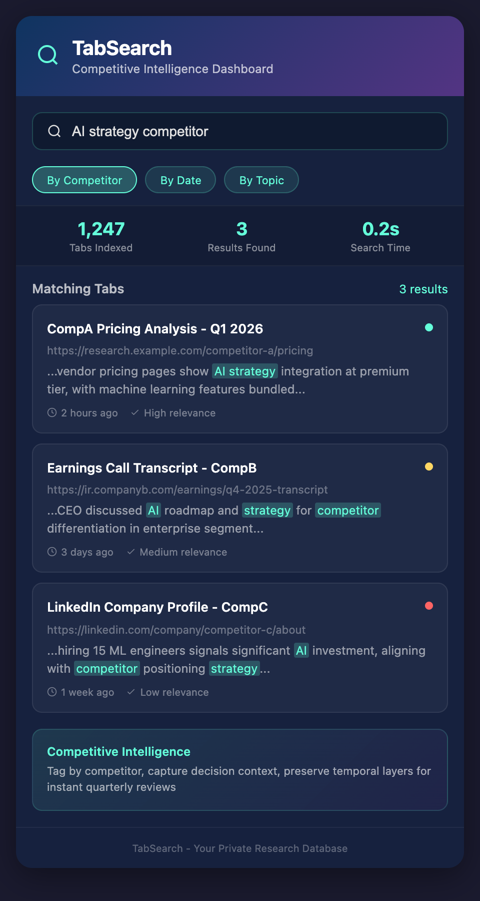 The problem isn't lack of discipline. Your team opens tabs for vendor pricing pages, earnings call transcripts, LinkedIn company profiles, and industry news articles. Each represents a data point in your competitive landscape. But without a searchable system, you're relying on fuzzy browser history, bookmarks organized by gut feeling, and the hope that someone remembers which tab had that crucial detail about competitor X's new product launch.