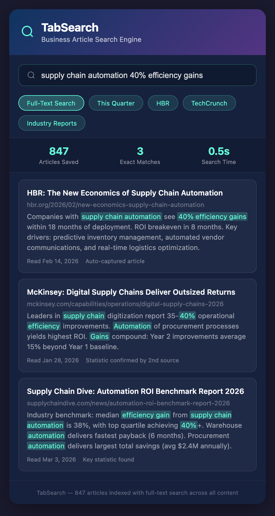 You read an article that said "companies with supply chain automation see 40% efficiency gains." You remember the statistic but not the article. Finding it requires searching through 50 potential candidates.