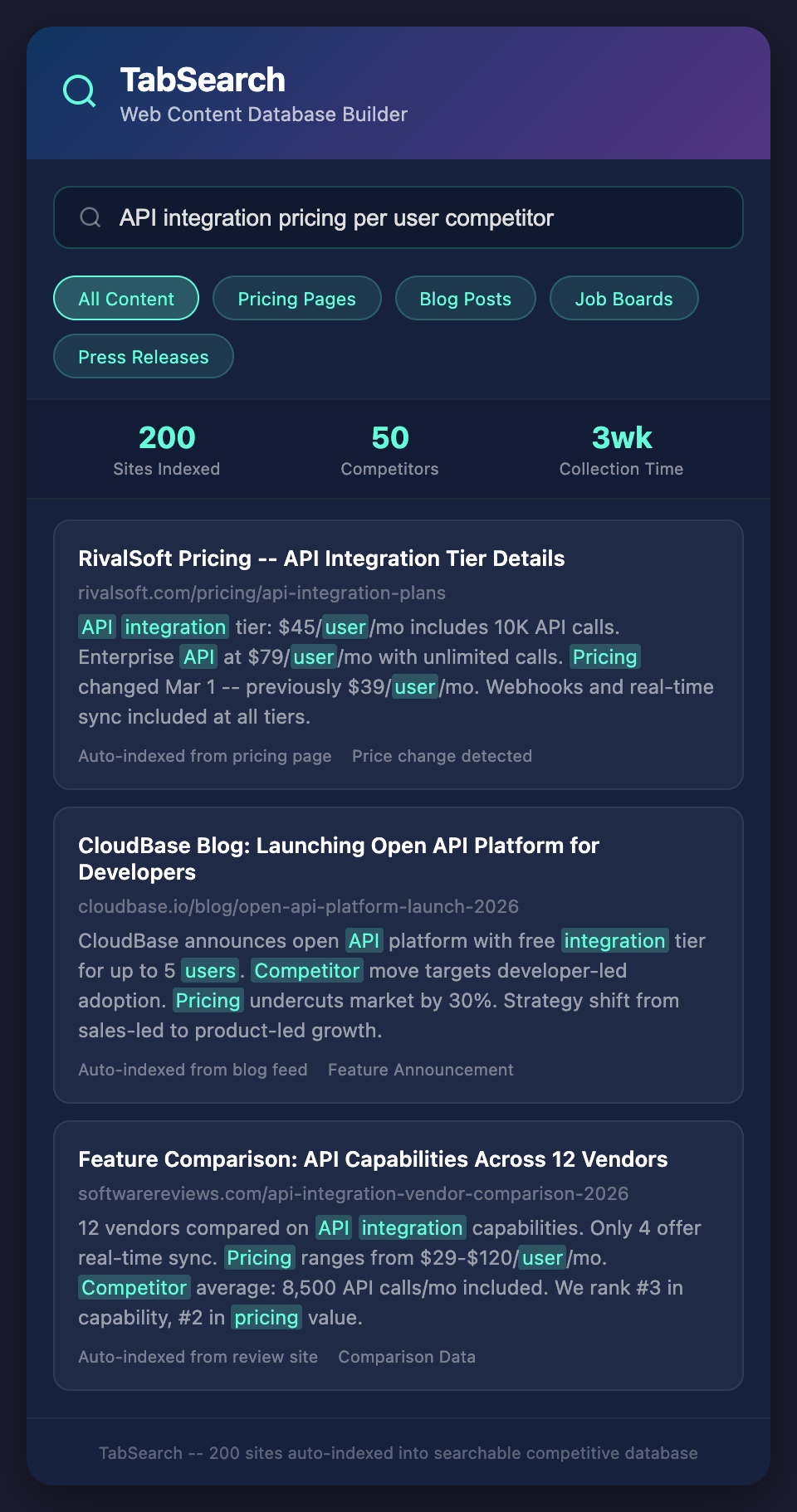 A searchable database of web research gives you real-time competitive knowledge. Not perfect knowledge, but immediate knowledge. That speed translates to better decisions, faster pivots, and smarter strategy.