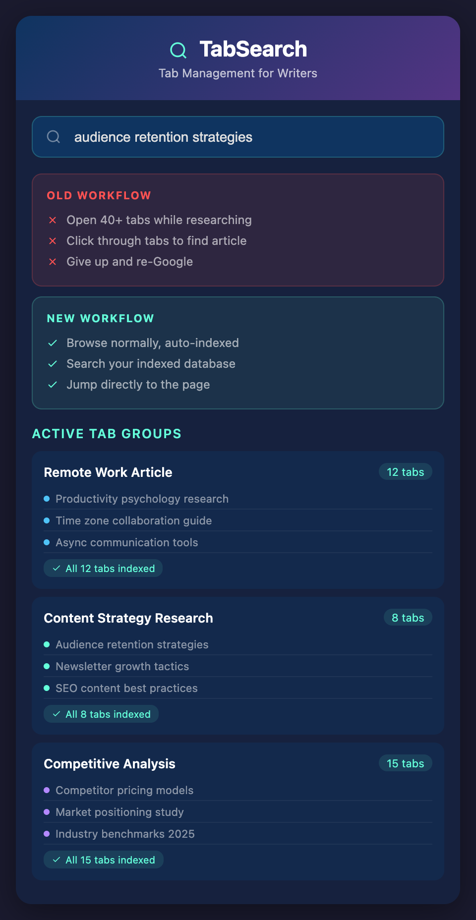 Browser Tab Groups: These let you organize tabs into labeled groups. But they're still manual, require active maintenance, and don't solve the core problem of finding specific content. You still can't search across groups.