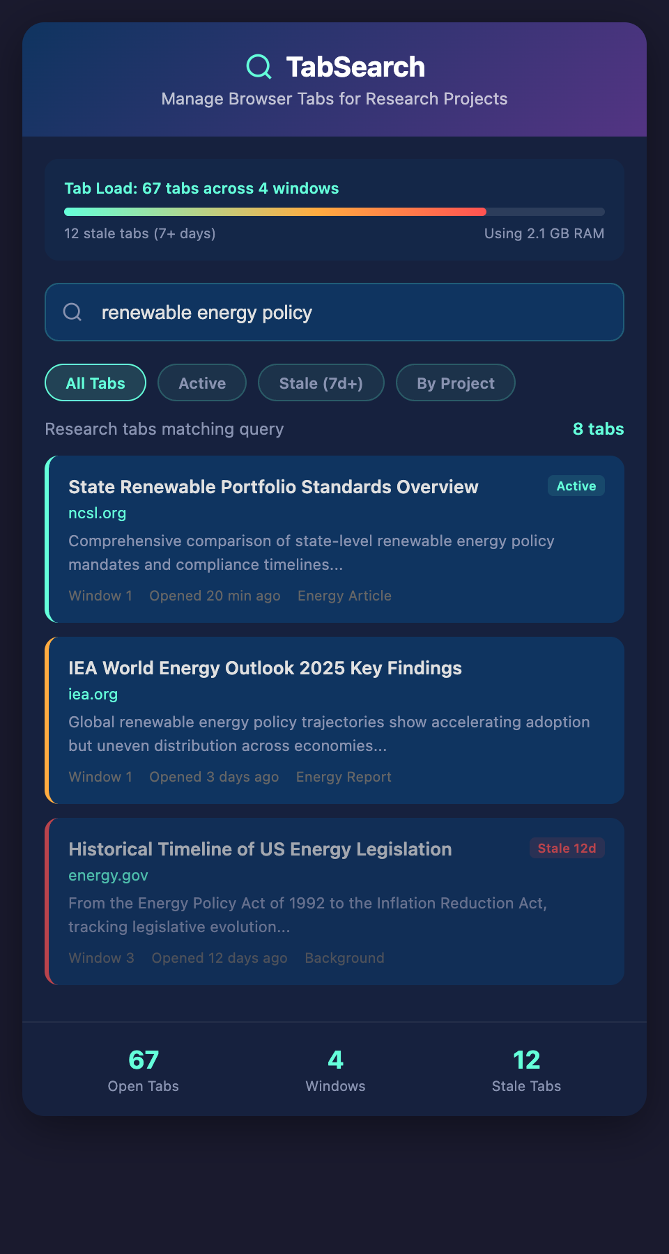 This inefficiency undermines research. You spend time tab-hunting instead of thinking. You leave tabs open indefinitely because closing them feels risky. You end up with unusable browser sessions where the interface itself becomes a barrier to productivity.