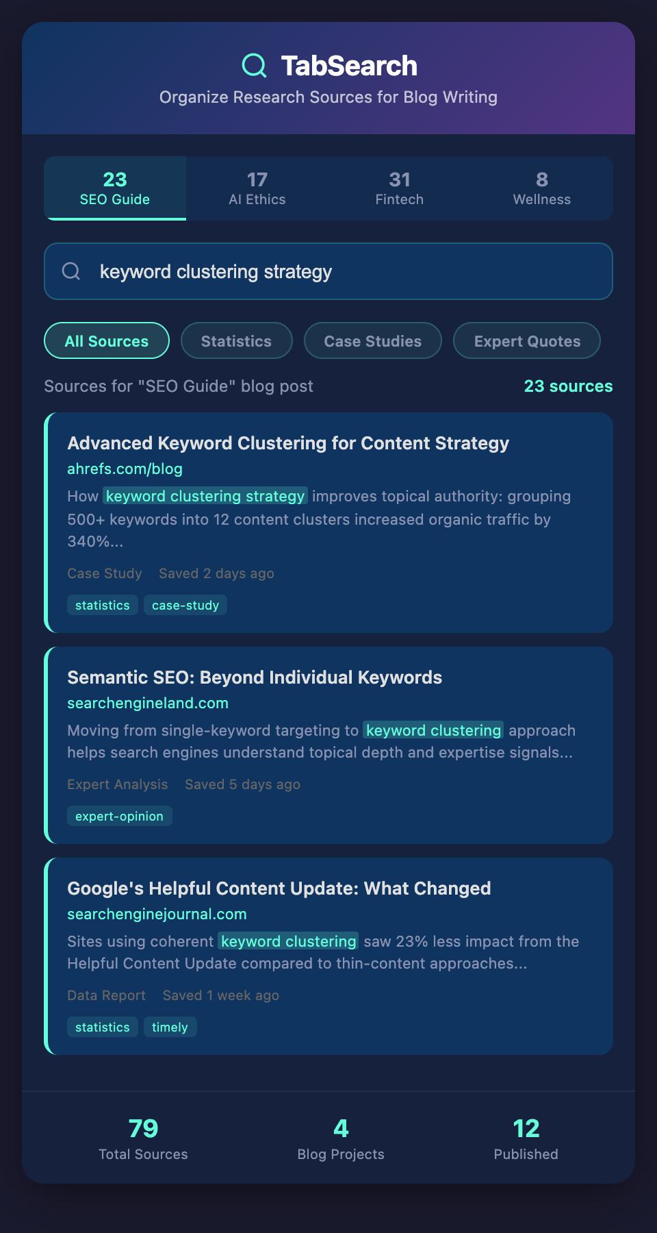 Spotting patterns: When all your research is in one place and searchable, you start noticing common themes, recurring experts, and patterns you wouldn't catch otherwise.