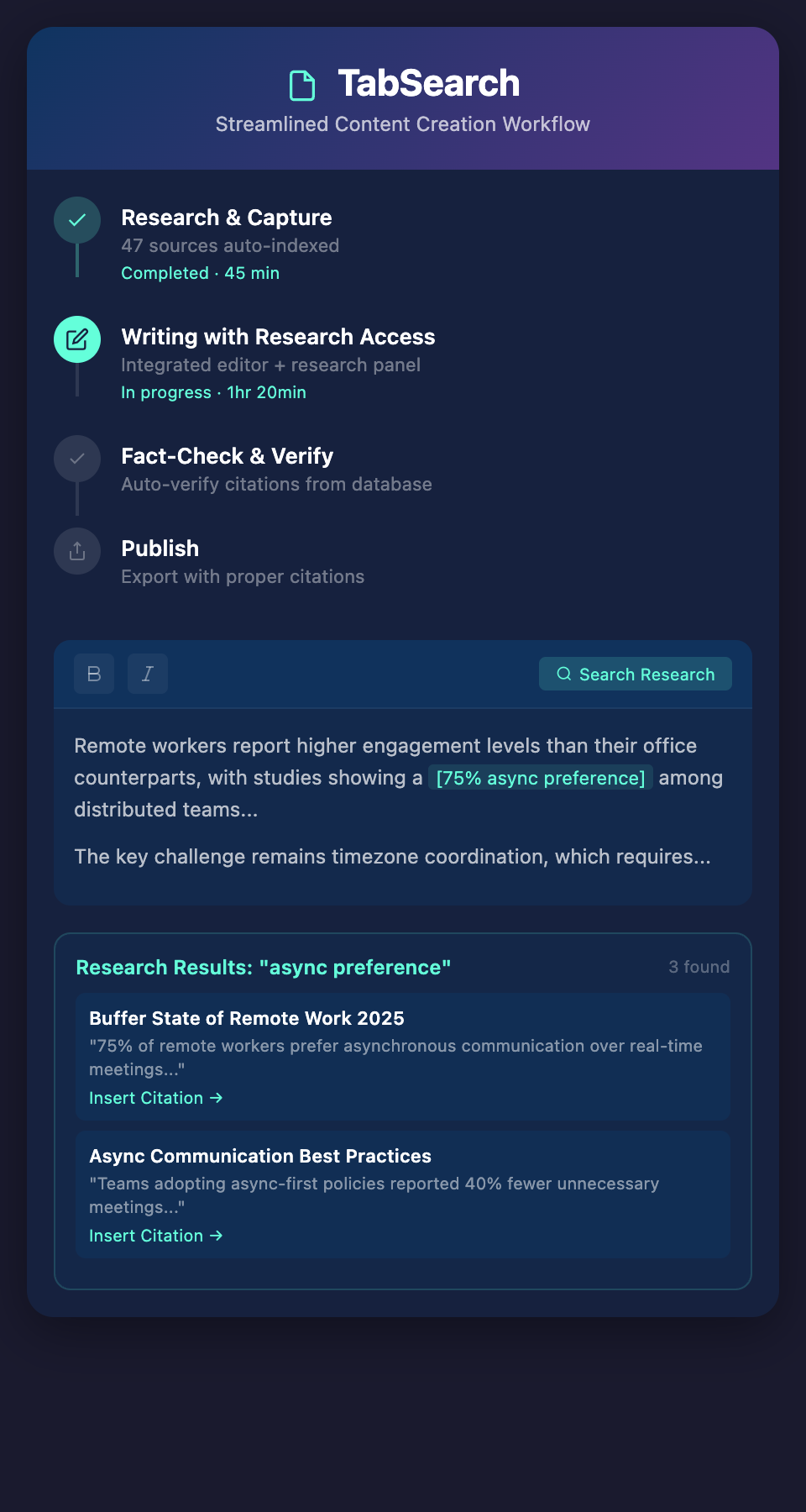 Most writers experience significant friction between these phases. Moving from research to writing requires context-switching. Fact-checking requires finding sources again. Publishing requires managing multiple platforms.
