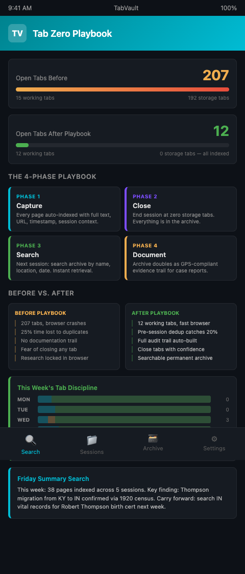 The genealogist tab overload solution is not better tab management. It is a different relationship with tabs entirely. Instead of using tabs as long-term storage for research leads, the researcher uses TabVault to turn every browser session into a permanent, searchable archive, then closes the tabs knowing that everything they contained is indexed, retrievable, and searchable by full text.