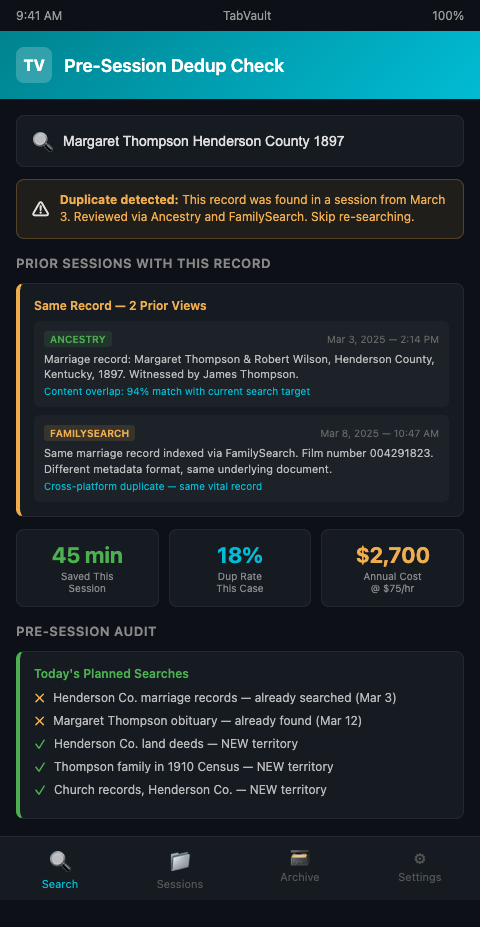 Duplicate record identification in genealogy is not a technology problem. It is a retrieval problem. TabVault gives researchers instant full-text search across every session they have ever conducted, catching duplication before it wastes billable hours and client patience. Join the waitlist to make redundant research a thing of your past.