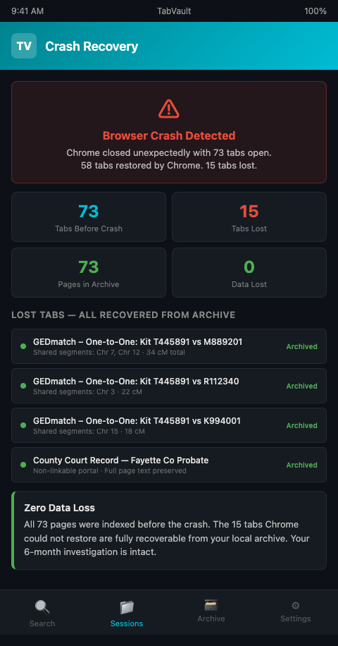 TabVault implements this for the unknown parentage investigation workflow. As you browse AncestryDNA match pages, GEDmatch comparisons, FamilySearch records, and court portals, each page is captured and indexed locally. When Chrome crashes and takes 15 tabs with it, the content of those pages is already in your archive. When a GEDmatch kit is deleted, the one-to-one comparison you ran against it is preserved in your index.