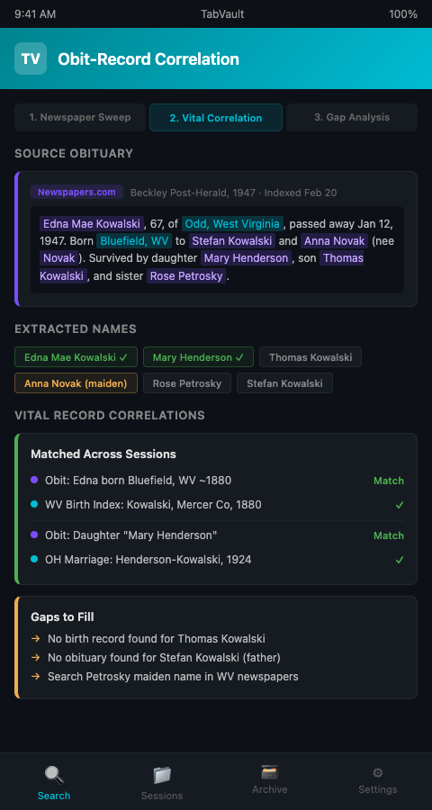 The disconnect happens because obituary research and vital records research typically occur in separate browser sessions, on separate days, using separate databases. The obituary lives in a Newspapers.com tab that got closed. The birth certificate lives in a state vital records portal that got closed. The correlation between them lives only in the researcher's memory, which is unreliable at the scale of a serious cold case.