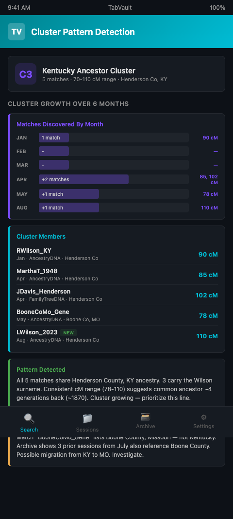 DNA match clusters do not announce themselves in a single session. They reveal themselves slowly, over months, as new testers appear and existing matches update their trees. TabVault is built for exactly this kind of long-horizon pattern detection. Each monthly match review you conduct adds another layer of indexed data to your archive, and a pre-session search against that growing archive regularly surfaces geographic overlaps, surname recurrences, and centimorgan-range patterns that no single review could reveal. Researchers who have tracked clusters across six or more months of indexed sessions describe the archive as the difference between guessing at connections and seeing them confirmed through accumulated evidence.