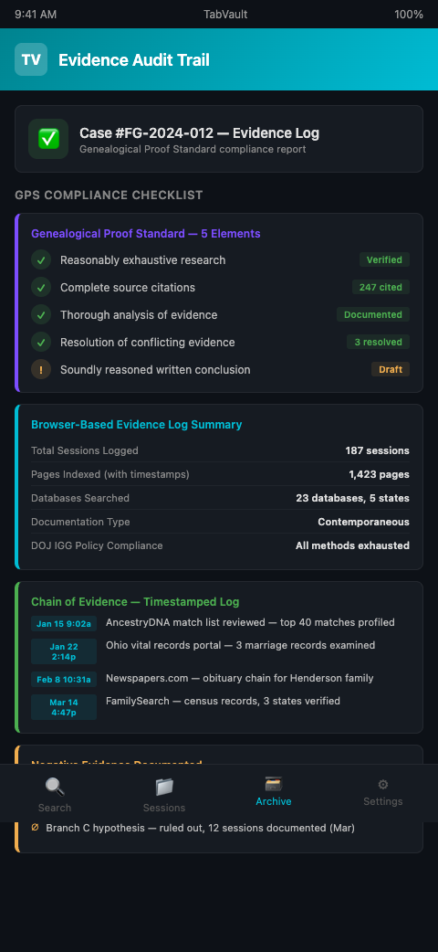 Courtroom testimony and professional peer review demand an auditable research trail, and TabVault creates one automatically from the moment you begin a case. Every session is timestamped and preserved with its full page content, producing contemporaneous records rather than retrospective reconstructions assembled under subpoena pressure. Forensic genealogists who adopt indexed session archiving at case inception report that evidence documentation, the task most practitioners find too burdensome to sustain manually, becomes a zero-effort byproduct of their normal browser workflow. The result is a research trail that satisfies Genealogical Proof Standard requirements without adding a single minute of administrative overhead to the investigative process.