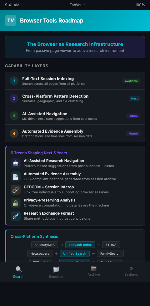 TabVault sits at the intersection of these trends by turning the browser from a passive display tool into active research infrastructure. Every page visited during a genealogy session is indexed with full-text content, timestamp, and session context, creating a searchable private database that grows with each research session. This is the foundation that next-generation features will build on.