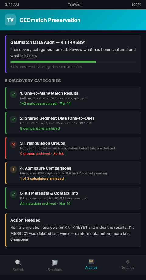 GEDmatch gives researchers extraordinary analytical power, but it stores nothing on your behalf. Every one-to-many result, every shared segment comparison, every triangulation group exists only as long as the underlying kits remain in the database and your browser tab stays open. The five discovery types above are the ones that researchers most consistently fail to save and most frequently need later. TabVault indexes them automatically, building a permanent archive from your GEDmatch sessions. Join the waitlist and stop losing the discoveries that matter most to your cases.