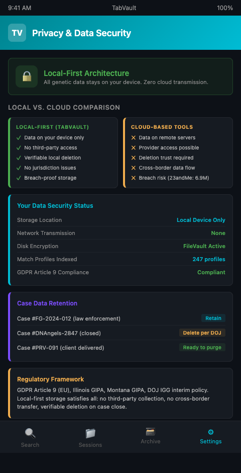 Every DNA match profile you examine during research contains genetic relationship data about real people who never consented to being investigated. That data deserves storage architecture that matches its sensitivity. TabVault keeps your entire research index on your local drive, encrypted and under your sole control, with zero data transmitted to any external server. When a case concludes and you need to verify that all session data has been destroyed, the deletion is local and auditable. Researchers handling law enforcement cases or sensitive adoption searches find that this local-first model is the only architecture that fully satisfies both DOJ destruction requirements and the ethical obligation to protect third-party genetic information.