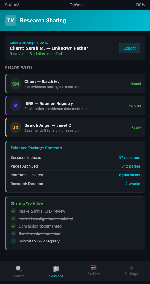 When the case resolves and findings need to be shared -- with the client, with a reunion registry, or with another search angel -- the researcher faces a documentation problem. The research happened in browser tabs that are now closed. The evidence trail exists only in the researcher's memory and whatever notes they took along the way. The submission to the reunion registry includes the conclusion ("We believe your biological father is John Kowalski, born 1952 in Cleveland") but not the chain of evidence that supports it.