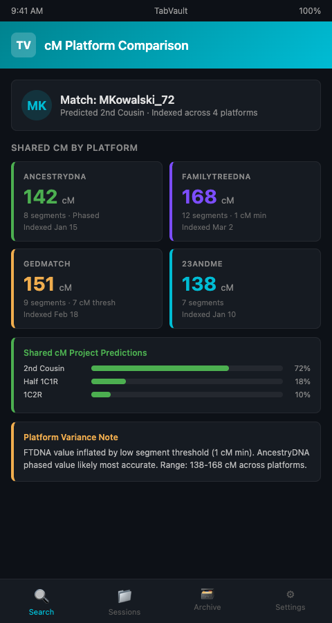 If you are tracking DNA matches across AncestryDNA, FamilyTreeDNA, 23andMe, and GEDmatch, your centimorgan data is scattered across platforms that each measure differently. TabVault consolidates every match page into one searchable archive where cross-platform comparison happens through search, not spreadsheets. Join the waitlist to bring order to your multi-platform DNA match review.