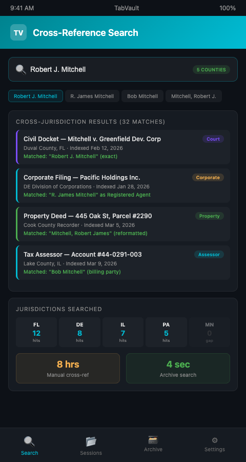 A person of interest who appears as "Robert J. Mitchell" in a county civil docket, "R. James Mitchell" in a state corporate filing, and "Mitchell, Robert J." in a property deed index requires separate searches across separate portals -- unless all three pages live in the same full-text archive. After six months of indexing across 30 government databases, one producer's TabVault archive turned a day-long manual cross-reference into a single search query that returned matches from five counties and two state registries in under eight seconds. Join the waitlist and automate the cross-referencing that spreadsheets were never designed to handle.
