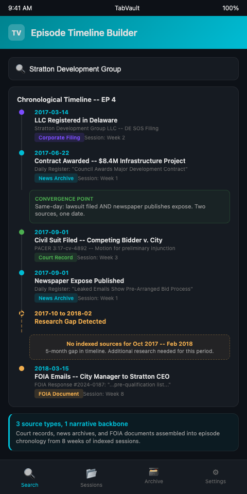 Producers who have been linking FOIA responses to news archive discoveries across episodes already have the building blocks. FOIA documents carry government-side dates. News archives carry publication-side dates. Court records carry judicial-side dates. When all three source types exist in the same searchable index, the chronological picture becomes three-dimensional.