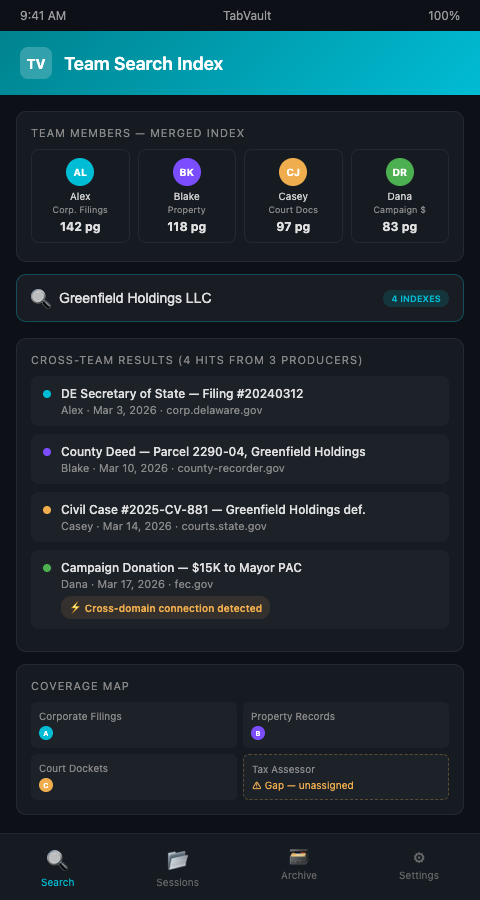 A four-person team investigating state-level procurement fraud assigned each producer a distinct research domain: corporate filings, property records, court dockets, and campaign finance. When their merged TabVault index surfaced the same registered agent across all four domains, the cross-thread connection broke the investigation open -- a link no single producer would have found alone. Within three months, the team's shared index held 1,100 pages across 15 government databases, and their daily pre-session deduplication checks eliminated an average of six hours per week in redundant record-pulling. Join the waitlist and build the shared search layer your collaborative investigation needs.