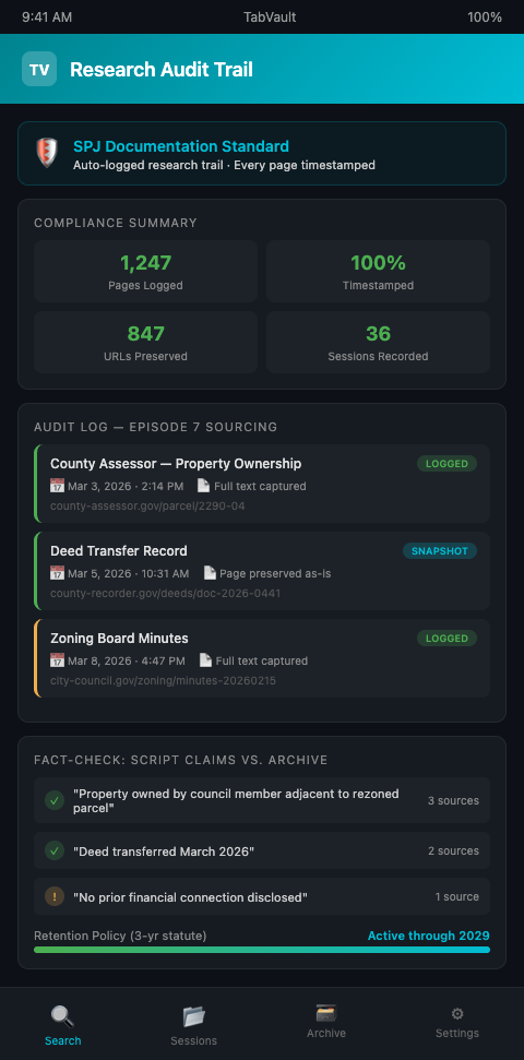 The practical value emerges when documentation is challenged. Suppose a city official disputes a claim in Episode 7 that they owned property adjacent to a rezoned parcel. The producer searches their TabVault archive for the official's name and the parcel address. The search returns the county assessor page indexed on March 3, the deed transfer record indexed on March 5, and the zoning board minutes indexed on March 8. Each result includes the full text of the page as it appeared on that date, the source URL, and the index timestamp. That is a research audit trail that satisfies editorial review, legal scrutiny, and the SPJ's requirement for source verification.