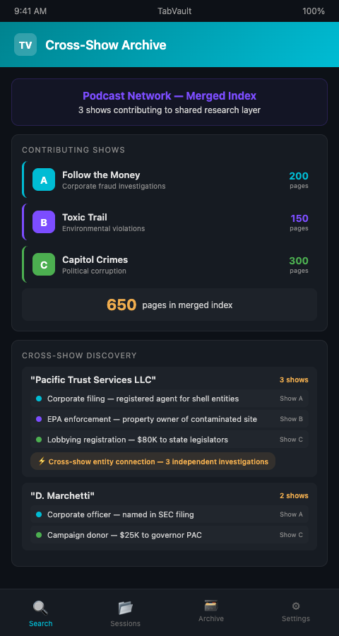 Three investigative shows in one network collectively index 650 pages per month across corporate filings, EPA enforcement actions, and campaign finance disclosures. When Show B's environmental reporter discovers an LLC whose registered agent also appears in corporate filings that Show A indexed three months earlier, the merged TabVault archive surfaces that cross-show connection in a single search. Without a merged index, that connection depends on a hallway conversation that may never happen. One podcast network identified four cross-show story leads in their first quarterly review after implementing a shared search layer. Join the waitlist and start connecting the research your network has already done.