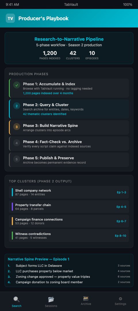 Phase 5: Publish and Preserve. After publication, the research archive becomes a permanent record of the investigation's evidentiary basis. Preserve the TabVault archive — with all session labels, timestamps, and indexed content — as the documentation layer for the published season. If a subject challenges a claim, the producer can search the archive and produce the sourcing chain within minutes.