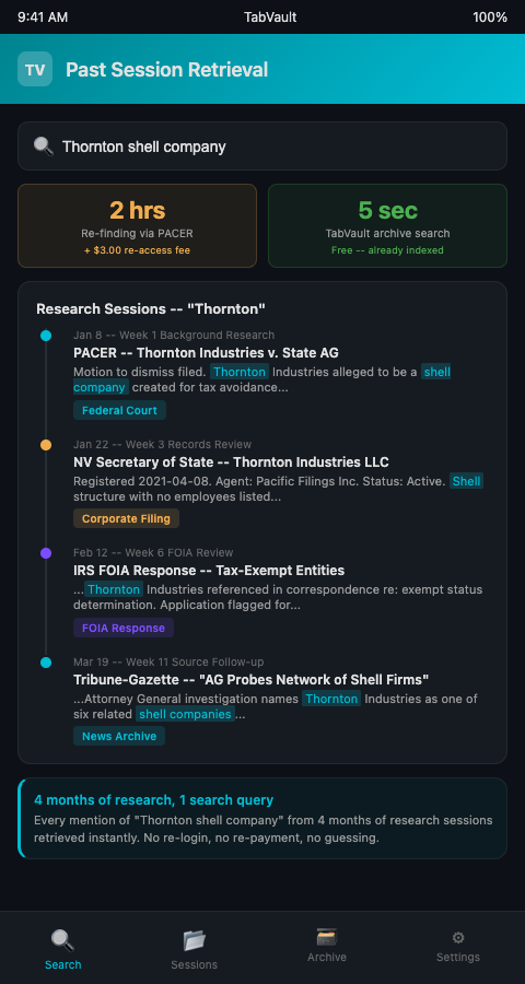Three months into a financial fraud investigation, a new tip points back to a PACER filing from week two. Your browser history shows 14 identical-looking PACER URLs. Three return login walls. Two return session-expired errors. TabVault would have indexed the full text of that filing -- case number, party names, motion language -- the moment you read it, making retrieval a five-second search instead of a two-hour reconstruction. Producers who index from day one report cutting retrieval time by 90 percent and eliminating duplicate PACER charges for records they already accessed. Join the waitlist and stop re-buying records you already read.