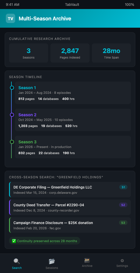 TabVault addresses this by turning chaotic browser sessions into a searchable private database that persists across production gaps. Every browser page visited during season one's research -- every court docket, every news article, every FOIA document, every corporate filing -- remains indexed and searchable when season two begins. The fourteen-month gap between seasons does not erase the archive.