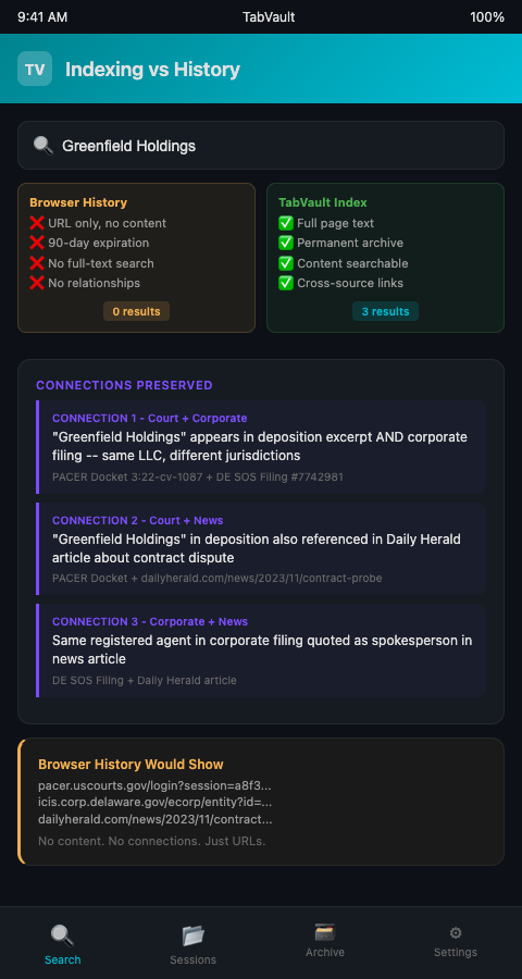Consider what full-text tab search means in practice. You remember that a witness mentioned "Greenfield Holdings" in a deposition excerpt you read two months ago, but you cannot recall whether it was in a court filing, a news report, or a FOIA document. With browser history, you would scroll through hundreds of URLs hoping to recognize the right one, then click through each to see if the page still loads and contains the phrase. With TabVault, you search "Greenfield Holdings" and every indexed page containing those words appears instantly — the deposition excerpt, a corporate filing that also mentions the name, and a city council meeting minutes page you had forgotten you ever visited.