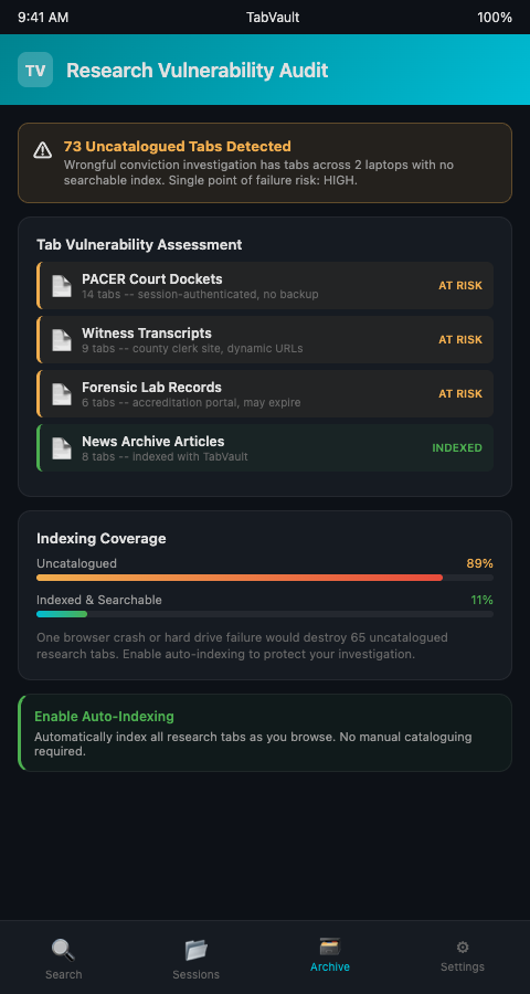 A wrongful conviction investigation that loses its research archive to a browser crash does not lose a few bookmarks -- it loses the evidential chain connecting forensic lab reports to witness statements to appellate rulings. TabVault prevents that loss by indexing every page as you browse, with zero manual effort. One true crime team catalogued 847 pages across a six-month cold case investigation, and when opposing counsel demanded documentation of their research process, they produced a timestamped archive covering every source consulted. Start indexing from your first research session and eliminate the single point of failure that uncatalogued tabs represent.