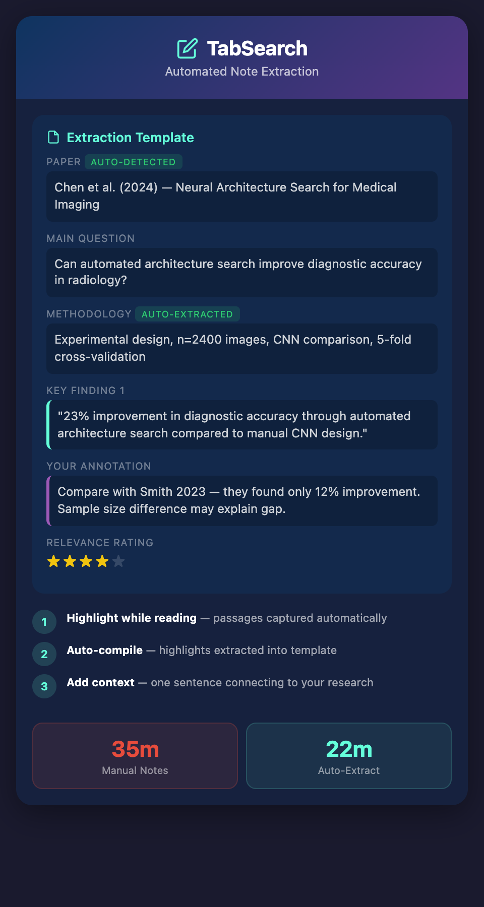 Time saved: 5-10 minutes per paper vs. 15-20 minutes of traditional note-taking.