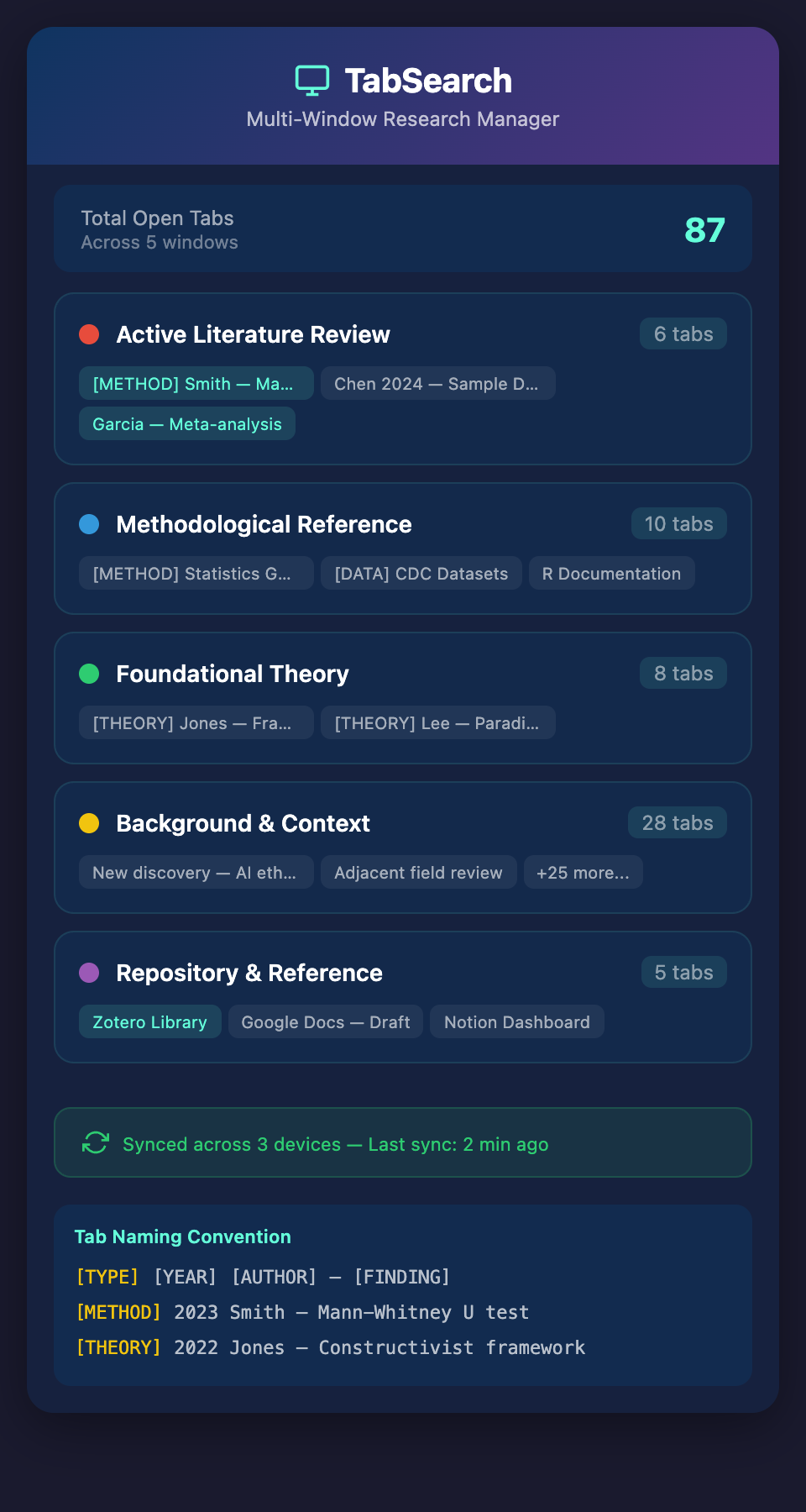 Use your browser's theme or use window-specific naming patterns to color-code them visually. Chrome allows you to theme each window differently. This becomes muscle memory: when you need methodological sources, you reach for the blue window.