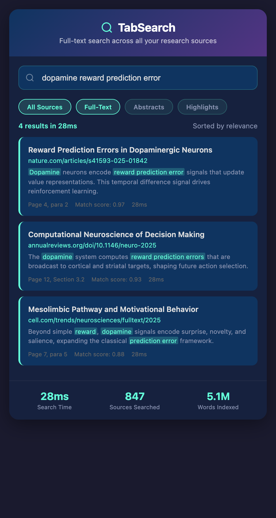 Full-text search isn't just searching titles and author names—it's searching the complete content of every source for any word or phrase.