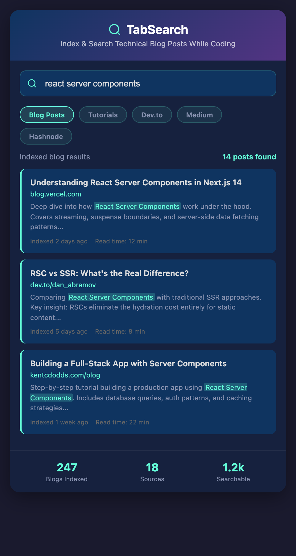 What would truly solve this is automatic indexing of technical blogs you visit. As you read blog posts during research, they're indexed in the background. Later, you can search across your entire reading history for specific concepts.
