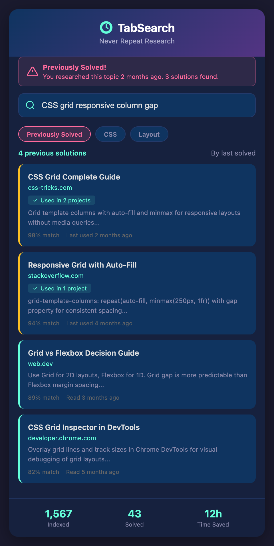 Imagine every solution you've ever researched and implemented being instantly retrievable. You're debugging a specific CSS grid issue. You search "CSS grid column gap responsive design", and instantly see: