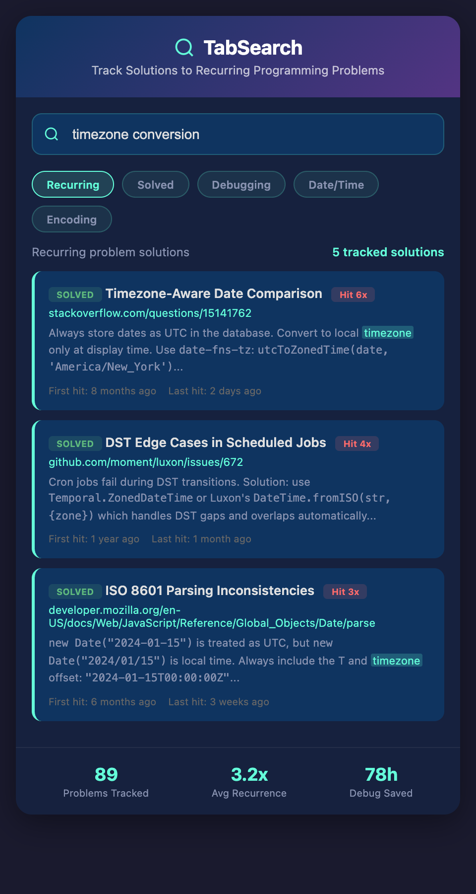 If you could search "CORS error in Node.js when calling AWS Lambda," you'd instantly see the three posts you found, the Stack Overflow answer that explained it, and the code fix you implemented. 10 minutes instead of 4 hours.