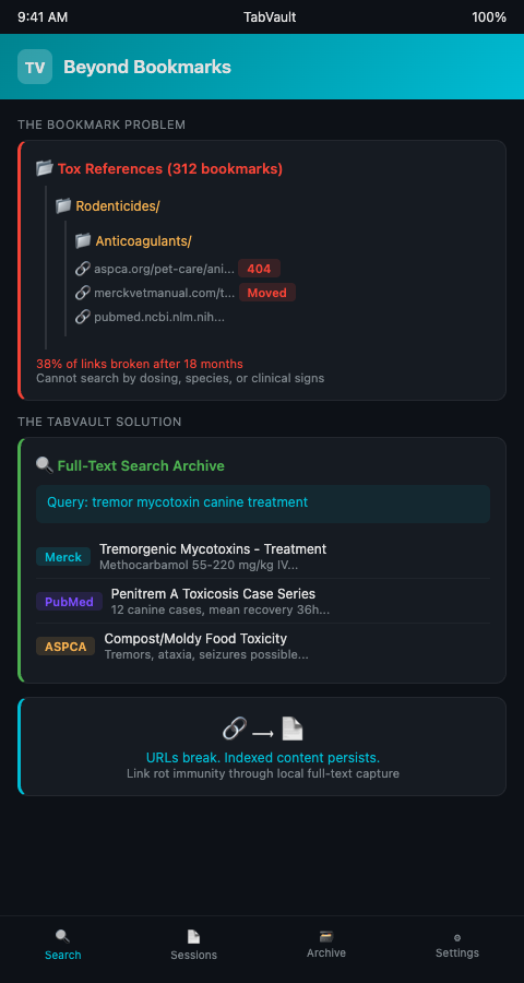 TabVault implements this model by turning chaotic browser sessions into a searchable private database, indexing every page a clinician visits in the background. The ASPCA toxin page, the Merck treatment entry, the PubMed case report, the manufacturer's Safety Data Sheet — all indexed, all full-text searchable, all retained locally. The bookmark folder becomes unnecessary because the indexed archive is more comprehensive (it captures everything, not just what you remembered to bookmark), more searchable (full text, not just URLs and titles), and more durable (local content, not dependent on external URLs).