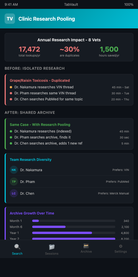 Dr. Nakamura's forty-five-minute thorough review of grape and raisin toxicosis on Saturday night becomes Dr. Pham's thirty-second search on Tuesday morning. TabVault captures every clinician's browsing automatically and makes it available to the entire team through a shared searchable archive. Eight veterinarians contributing research across four daily shifts build a collective knowledge base that covers more sources, more toxin presentations, and more treatment approaches than any individual could assemble alone. After a year, the shared archive represents thousands of vetted reference pages shaped by the practice's actual caseload — a resource that gets richer with every shift and benefits every clinician who queries it.