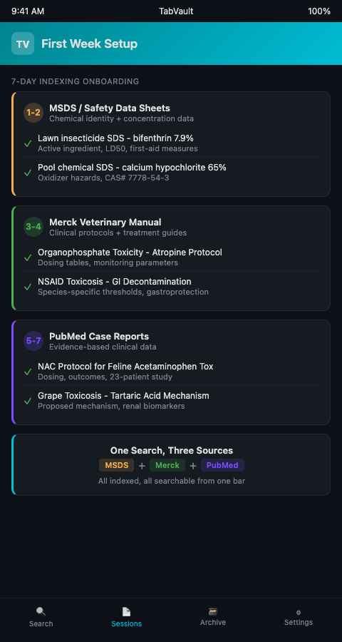 By Friday of your first week with TabVault, your archive already contains every SDS you opened for chemical exposure cases, every Merck Veterinary Manual treatment entry you consulted, and every PubMed abstract you scanned during rounds. That three-source foundation grows with each subsequent shift. A month in, your index holds the organophosphate atropine protocol from the Tuesday night farm dog case, the PubMed meta-analysis on NAC efficacy your attending recommended, and the manufacturer SDS for the specific rodenticide brand your clinic encounters most often. Each source type reinforces the others, and a single search query cuts across all three simultaneously.